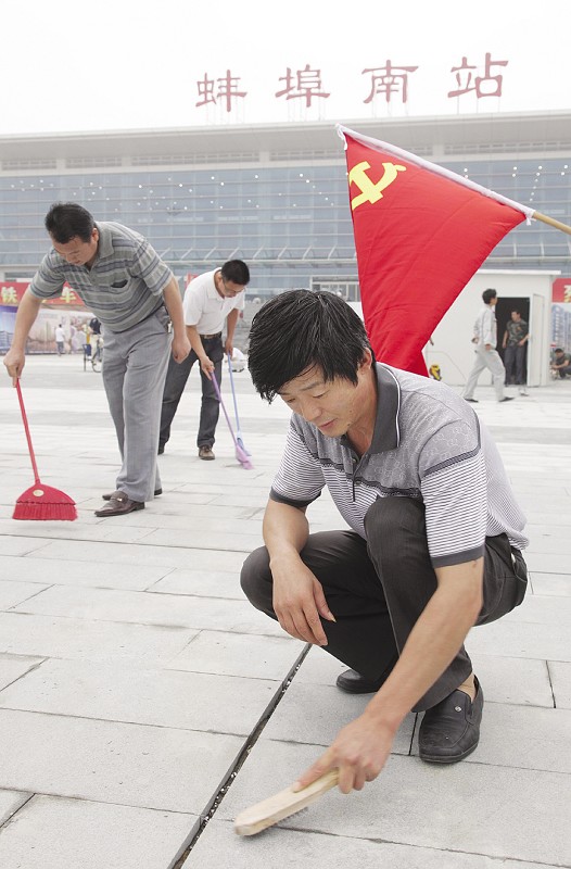6月25日上午,為慶祝中國共產(chǎn)黨建黨90周年暨京滬高鐵開通,蚌投集團(tuán)黨委組織集團(tuán)本部及所屬19個(gè)子公司共計(jì)198名黨員去高鐵蚌埠南站義務(wù)勞動(dòng),清理南站廣場(chǎng)建筑垃圾并清掃地面,為高鐵通車做出一個(gè)黨員力所能及的貢獻(xiàn)。