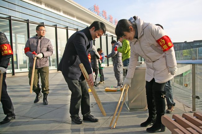 志愿者分成兩組。環(huán)境衛(wèi)生組負(fù)責(zé)擦洗護(hù)欄、清掃路面等保潔服務(wù)。文明交通服務(wù)組負(fù)責(zé)為旅客指路、文明交通勸導(dǎo)服務(wù)。通過志愿者辛勤勞動(dòng),高鐵南站廣場環(huán)境衛(wèi)生更加潔凈,行人車輛通行有序,高鐵南站作為我市的城市客廳更加亮麗。