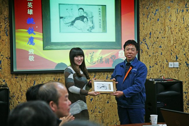 在學模范環(huán)節(jié),我們的“身邊人”—來自公司系統(tǒng)中環(huán)水務有限公司的蚌埠助人為樂好人姚鐵鷹,講述他十年義務獻血2萬5千毫升的感人事跡。在活動現(xiàn)場,公司向姚鐵鷹贈送了由志愿者們制作的記錄他獻血義舉時的肖像,并向全體職工倡議:向蚌埠好人姚鐵鷹學習,將志愿服務化作自覺行為和生活方式。