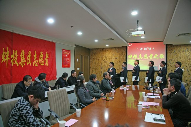 在談感悟環(huán)節(jié),主持人介紹了近期公司志愿者注冊登記工作開展情況,宣布成立蚌投集團志愿服務隊。在本環(huán)節(jié)中, 6名志愿者現(xiàn)場為大家?guī)砹嗽姼枥收b——《蚌投志愿者之歌》并莊嚴宣誓。